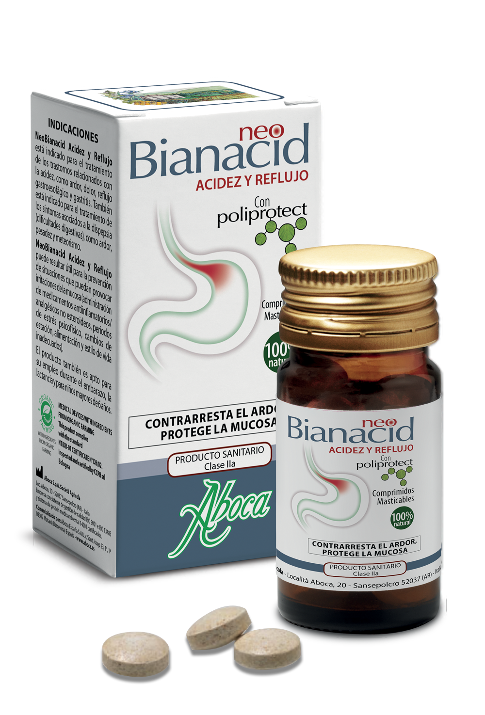 NeoBianacid Acidez y Reflujo es un producto sanitario a base de complejos moleculares vegetales y minerales, que ejerce una acción protectora y lenitiva de la mucosa gastroesofágica útil para contrarrestar rápidamente el ardor, el dolor, la sensación de acidez, es decir, los síntomas típicos de la irritación y la inflamación de esta misma mucosa. NeoBianacid Acidez y Reflujo es un producto 100% natural, biológico, sin gluten y de sabor agradable.\r\n\r\nNeoBianacid Acidez y Reflujo está indicado para el tratamiento de los trastornos relacionados con la acidez, como ardor, dolor, reflujo gastroesofágico y gastritis.\r\n\r\nTambién está indicado para el tratamiento de los síntomas asociados a la dispepsia (dificultades digestivas), como ardor, pesadez y meteorismo.\r\n\r\nNeoBianacid Acidez y Reflujo puede resultar útil para la prevención de situaciones que puedan provocar irritaciones de la mucosa (administración de medicamentos antiinflamatorios/analgésicos no esteroideos, periodos de estrés psicofísico, cambios de estación, alimentación y estilo de vida inadecuados).\r\n\r\nEl producto también es apto para su empleo durante el embarazo, la lactancia y para niños mayores de 6 años.\r\n\r\nNeoBianacid Acidez y Reflujo forma sobre la mucosa una película con efecto barrera, que la protege del contacto con los jugos gástricos y las sustancias irritantes.\r\n\r\nMODO DE EMPLEO\r\n\r\nTomar un comprimido según necesidad, dejándolo disolver lentamente en la boca. En caso de reflujo gastroesofágico se recomienda tomar un comprimido después de las comidas principales y otro por la noche antes de acostarse.\r\n\r\nEn los casos de ardor y pesadez asociados a dificultades digestivas (dispepsia), tomar un comprimido después de las comidas.\r\n\r\nEn todos los casos, si es necesario, la toma puede repetirse varias veces al día, incluso al cabo de poco tiempo. El producto también puede ser tomado por niños mayores de 6 años, con la misma posología. El producto puede tomarse incluso durante periodos prolongados. Se recomienda utilizar el producto antes de 6 meses desde la apertura del frasco.\r\n\r\n