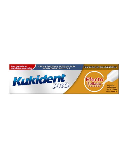 Los adhesivos para prótesis dentales pueden mejorar la fijación y sensación de tu prótesis. Ayudan a evitar que la prótesis se desenganche al hablar y te ayudan a sentirte seguro de que nadie más la nota. Evita las partículas irritantes y disfruta de una fijación segura durante todo el día. ¡No hay nada más molesto que la filtración de partículas de comida debajo de tu prótesis dental! Afortunadamente ahora existe una forma fiable de prevenirlo: Kukident Efecto Sellado. La boquilla de Kukident Efecto Sellado es un 75% más fina que la versión original, permitiéndote aplicar el adhesivo en líneas finas y precisas en lugar de puntos, con lo que creas una barrera más fuerte ante las partículas de comida irritantes como semillas o frutos secos. Los adhesivos para prótesis dentales de Kukident están disponibles en distintas variedades fáciles de utilizar, ofreciéndote una fijación fuerte y duradera que te permite vivir la vida sin límites. Mejor protección ante la filtración de partículas de comida comparado con Kukident Original. Beneficios: -Fijación fuerte: fija la prótesis dental durante todo el día. -Confort mejorado: ofrece amortiguación entre las encías y la prótesis para un ajuste preciso y cómodo. -Nuestro mejor sello ante las partículas de comida: su boquilla extrafina ayuda a formar un sello para evitar que las partículas de comida como semillas o frutos secos se filtren debajo de tu prótesis dental. Modo de aplicación: 1. Limpia las prótesis dentales y las encías a fondo. 2. Para conseguir mejores resultados, aplica unas líneas finas de adhesivo a lo largo de los bordes de la prótesis para formar una fijación fuerte y una barrera altamente efectiva frente a la filtración de partículas de comida. 3. Aclara la boca con agua antes de insertar la prótesis dental. Nuestro adhesivo para prótesis dentales está diseñado para reaccionar con la humedad y formar una fina capa de sello para evitar la filtración de comida. 4. Presiona la prótesis con firmeza en su lugar y sujétala durante unos instantes. 5. Para conseguir mejores resultados, espera de 15 a 30 minutos antes de comer o beber. No usar más producto que el que se muestra en el dibujo (no más de 1,25 g, siguiendo cuidadosamente las instrucciones). Si el producto rebosa fuera de la prótesis dental en la boca, significa que estás usando demasiado. No usar el producto más de una vez al día. Con un uso adecuado, el tubo durará al menos 4 semanas. No usar más producto del recomendado para fijar prótesis que no ajustan bien. No usar más cantidad de la indicada. Contiene zinc, consulta a tu médico/dentista si usas otros productos que contienen zinc.