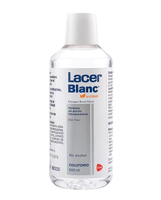 Colutorio con fórmula de acción blanqueadora sabor citrus. Lacer blanc es un enjuague bucal de uso diario que devuelve a los dientes su color natural, brillo y suavidad sin dañar el esmalte. Lacer blanc evita la formación de placa bacteriana y la acumulación de sarro, previene la aparición de caries y sensibilidad dental, además de incorporar un efecto protector de encías. Modo de empleo: Después del cepillado dental, realizar un enjuague bucal 2-3 veces al día con 10 ml Lacer Blanc Colutorio. Mantener el colutorio en la boca durante 1 minuto. No precisa enjuague posterior con agua. Para un tratamiento blanqueador completo, utiliza la pasta dentrífica Lacer Blanc Plus.