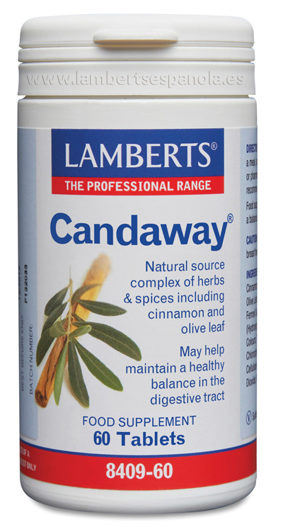\r\nCandaway® es una fórmula exclusiva que contiene potentes extractos de corteza de canela combinada con hoja de olivo y orégano, plantas utilizadas tradicionalmente para el mantenimiento y balance del sistema digestivo, y ayuda en la función del tracto intestinal.\r\n\r\nTome 2 tabletas al día.\r\nNo superar la dosis diaria expresamente recomendada.\r\n\r\nNota de alérgenos\r\n\r\nVea la sección de presentación para los ingredientes enumerados en negrita.\r\n\r\nSe excluye la siguiente lista de alérgenos: ingredientes que contienen trigo, cebada, soja, huevos, leche (y productos lácteos), lactosa, nueces, sulfitos, apio, levadura y gluten.\r\n\r\nPrecauciones\r\n\r\nEste producto no está recomendado para mujeres embarazadas o en período de lactancia.