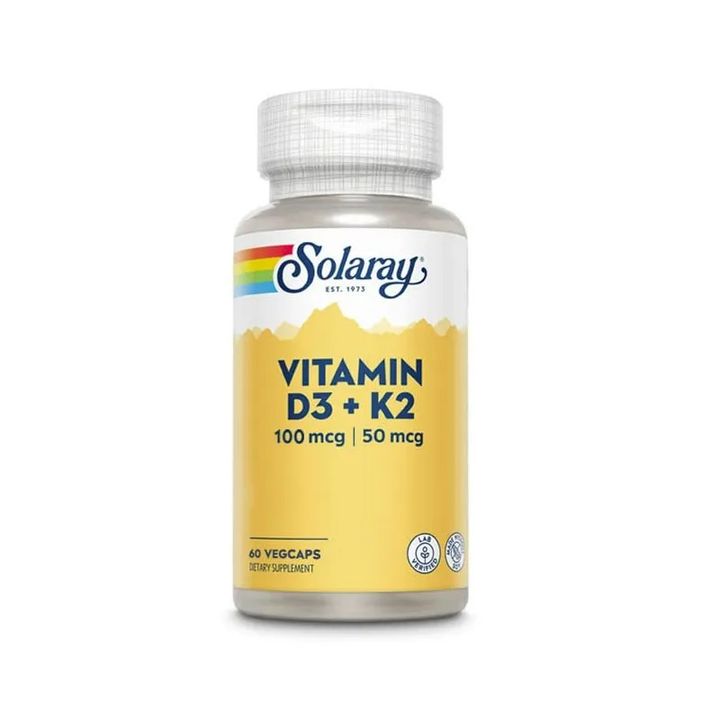 SOLARAY VITAMINA D3/K2 60 CÁPSULAS es un suplemento nutricional formulado para potenciar la salud ósea y cardiovascular. La combinación de las vitaminas D3 y K2 proporciona un apoyo sinérgico en la regulación del metabolismo del calcio en el organismo.